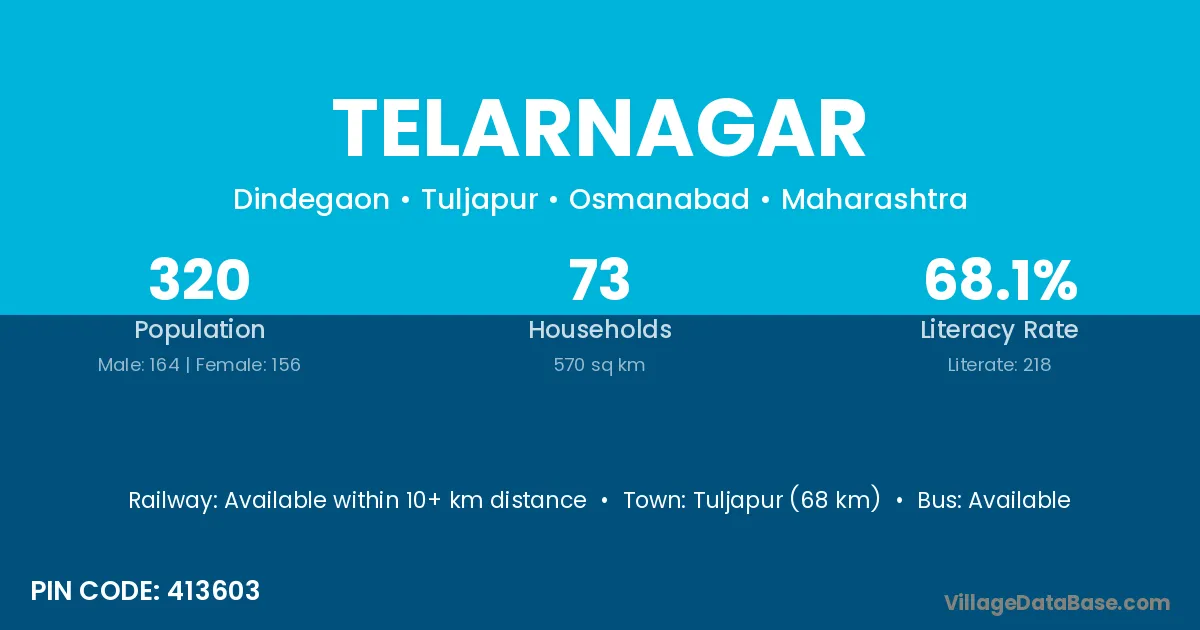 Tuljapur (68 km) is the nearest town to Telarnagar village for major economic activities and is located approximately 68 km away.