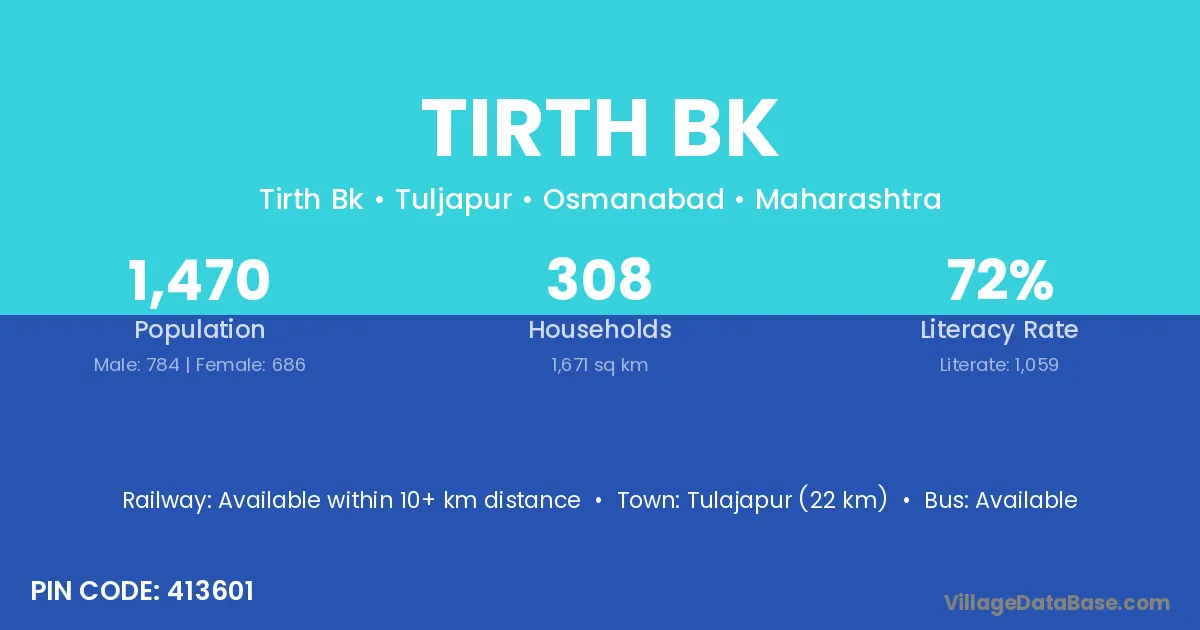 Tulajapur (22 km) is the nearest town to Tirth Bk village for major economic activities and is located approximately 22 km away.
