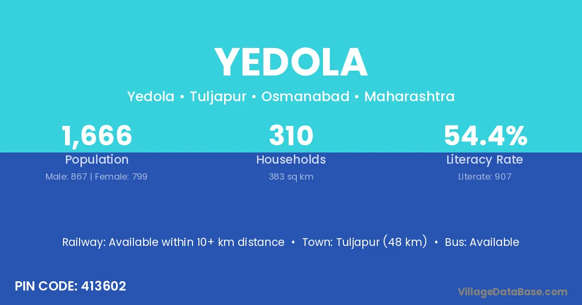 Tuljapur (48 km) is the nearest town to Yedola village for major economic activities and is located approximately 48 km away.