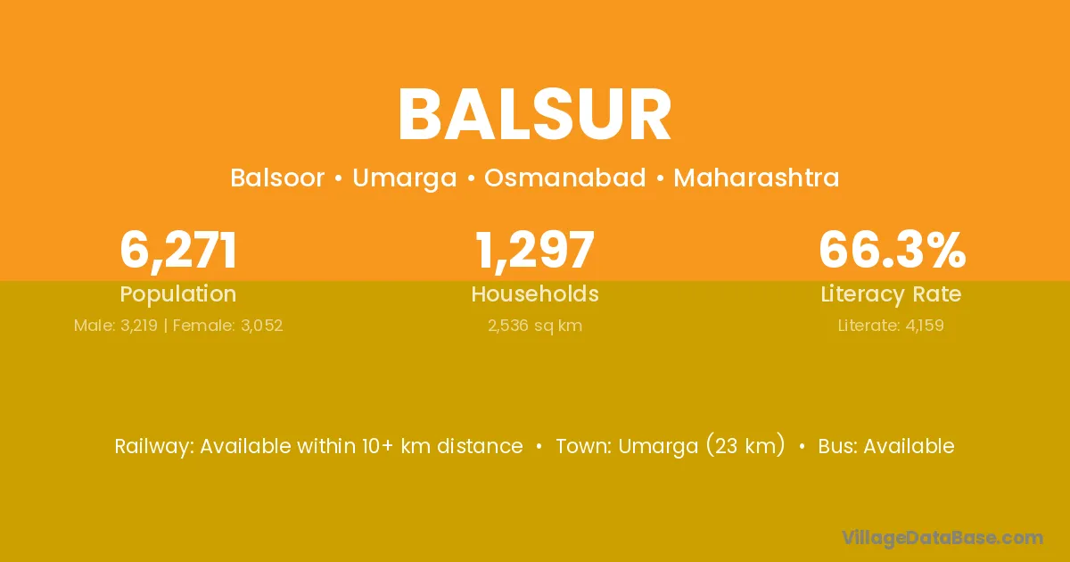 Umarga (23 km) is the nearest town to Balsur village for major economic activities and is located approximately 23 km away.