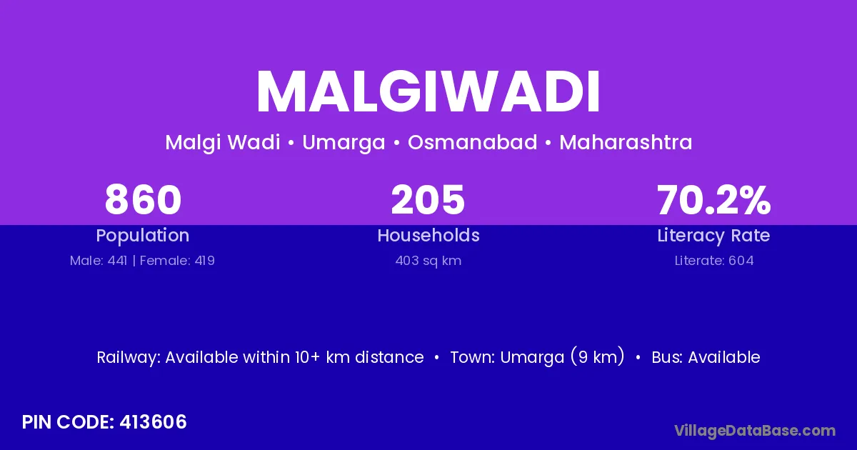 Umarga (9 km) is the nearest town to Malgiwadi village for major economic activities and is located approximately 9 km away.