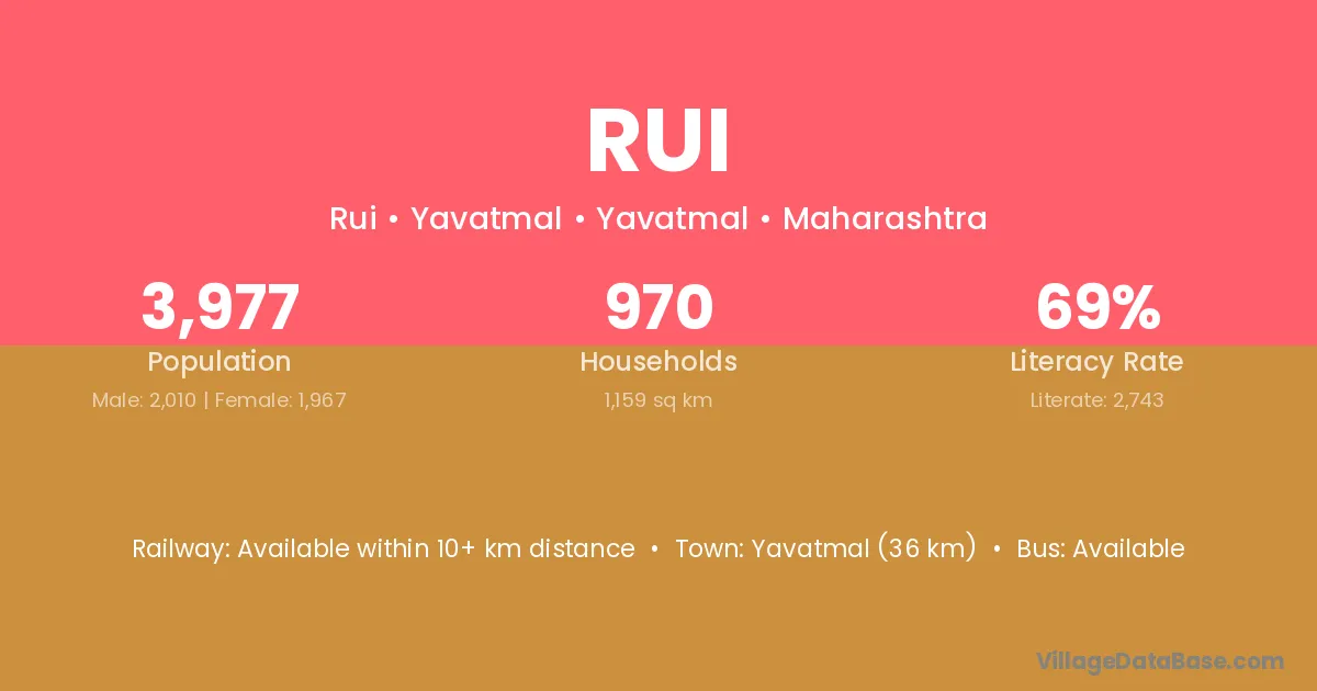 Kalamb (30 km) is the nearest town to Rui village for major economic activities and is located approximately 30 km away.