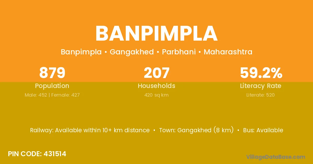 Gangakhed (8 km) is the nearest town to Banpimpla village for major economic activities and is located approximately 8 km away.