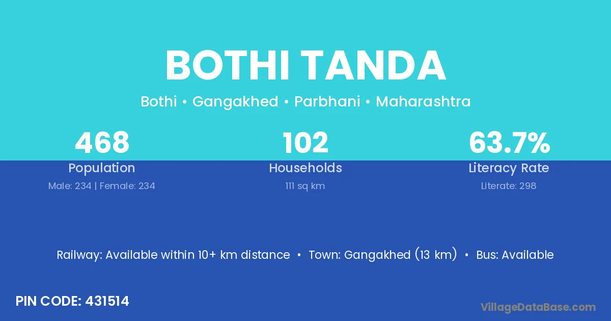 Gangakhed (13 km) is the nearest town to Bothi Tanda village for major economic activities and is located approximately 13 km away.
