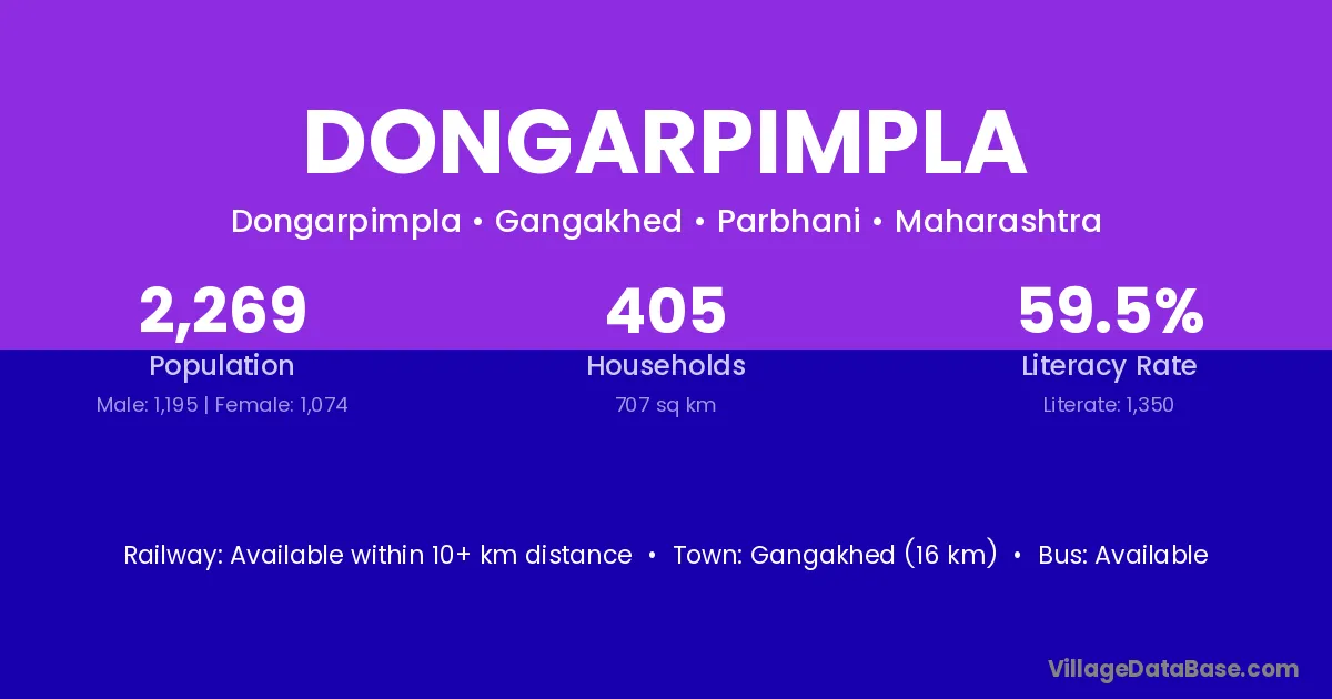 Gangakhed (16 km) is the nearest town to Dongarpimpla village for major economic activities and is located approximately 16 km away.
