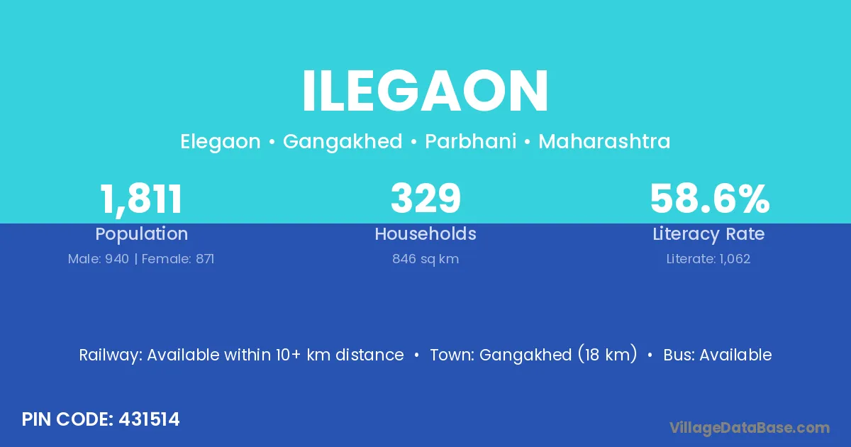 Gangakhed (18 km) is the nearest town to Ilegaon village for major economic activities and is located approximately 18 km away.