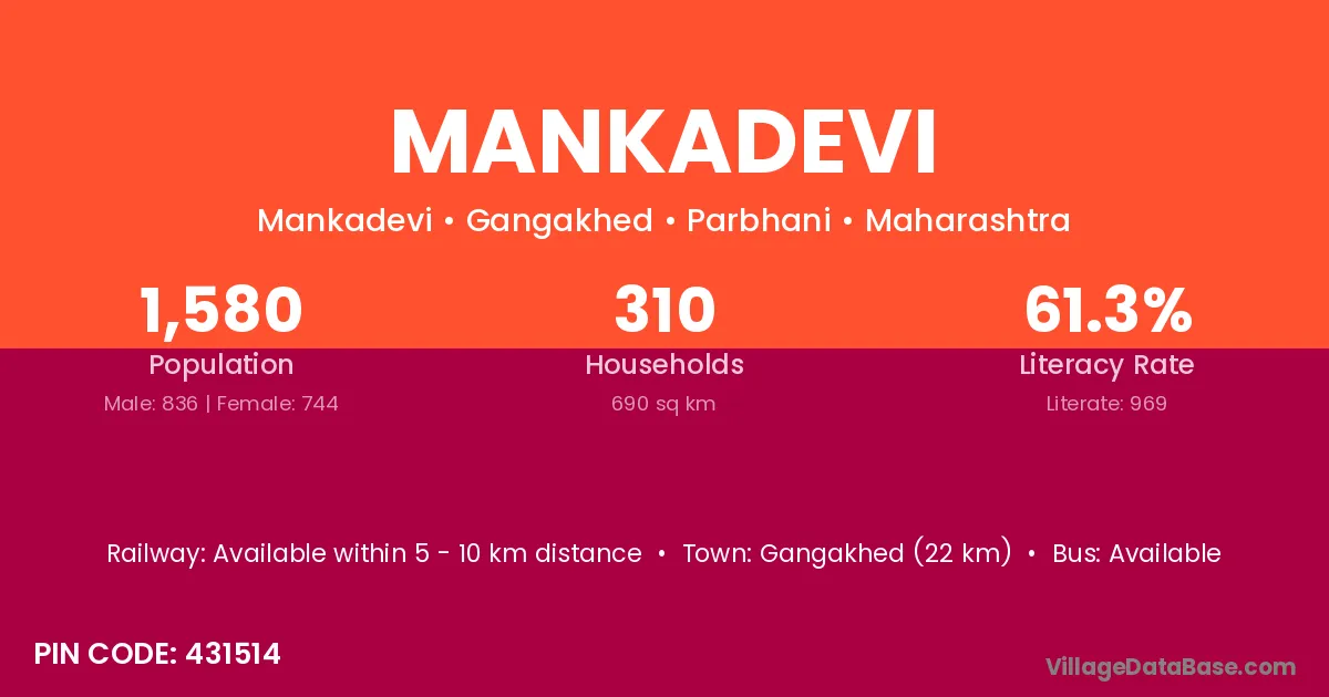 Gangakhed (22 km) is the nearest town to Mankadevi village for major economic activities and is located approximately 22 km away.