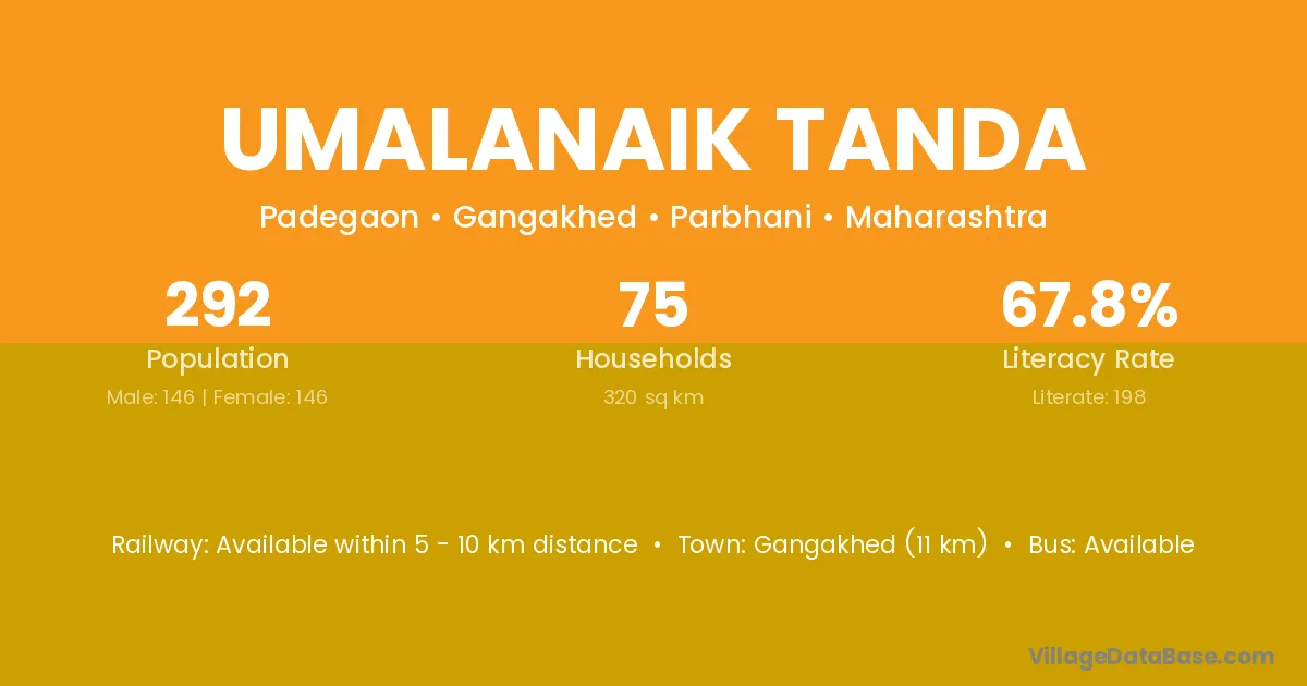 Gangakhed (11 km) is the nearest town to Umalanaik Tanda village for major economic activities and is located approximately 11 km away.