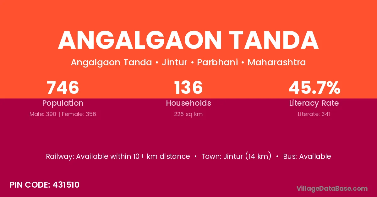 Angalgaon Tanda village has a total population of 746 people, of which 390 are males and 356 are females.