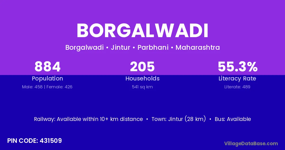 Jintur (28 km) is the nearest town to Borgalwadi village for major economic activities and is located approximately 28 km away.