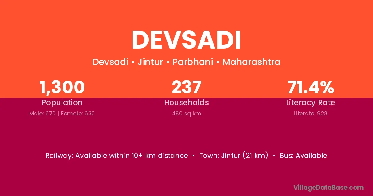 Jintur (21 km) is the nearest town to Devsadi village for major economic activities and is located approximately 21 km away.