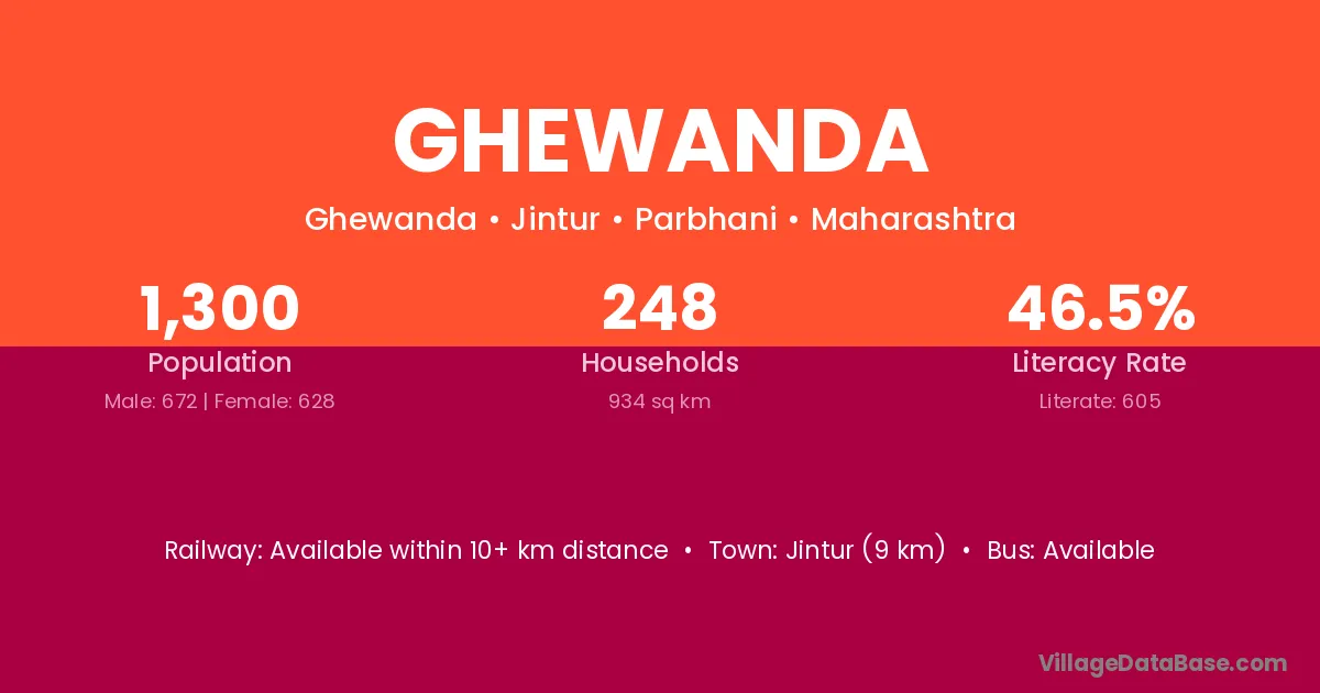 Jintur (9 km) is the nearest town to Ghewanda village for major economic activities and is located approximately 9 km away.