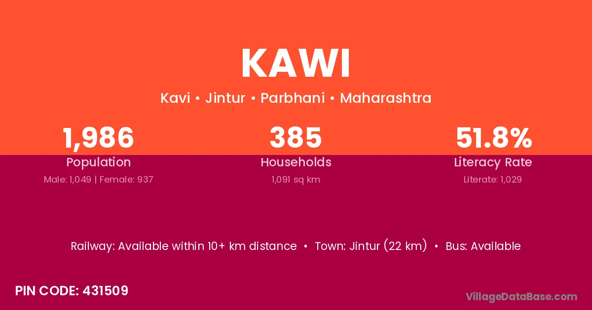 Jintur (22 km) is the nearest town to Kawi village for major economic activities and is located approximately 22 km away.