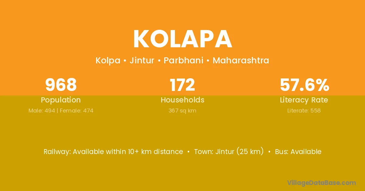 Jintur (25 km) is the nearest town to Kolapa village for major economic activities and is located approximately 25 km away.