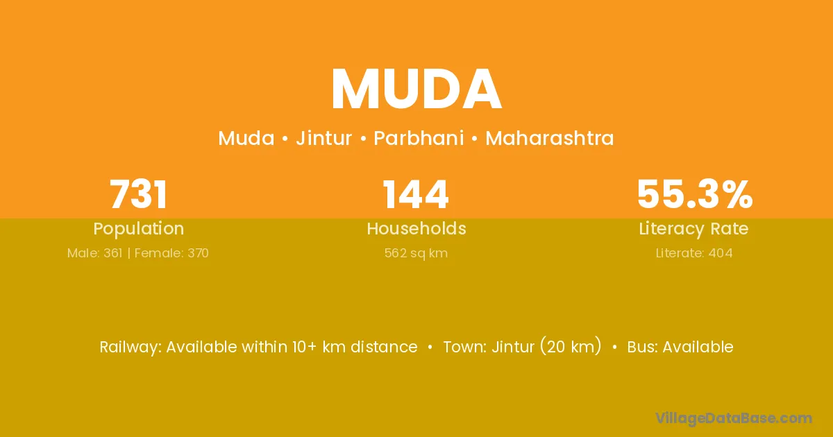 Jintur (20 km) is the nearest town to Muda village for major economic activities and is located approximately 20 km away.