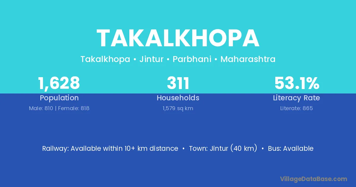 Jintur (40 km) is the nearest town to Takalkhopa village for major economic activities and is located approximately 40 km away.