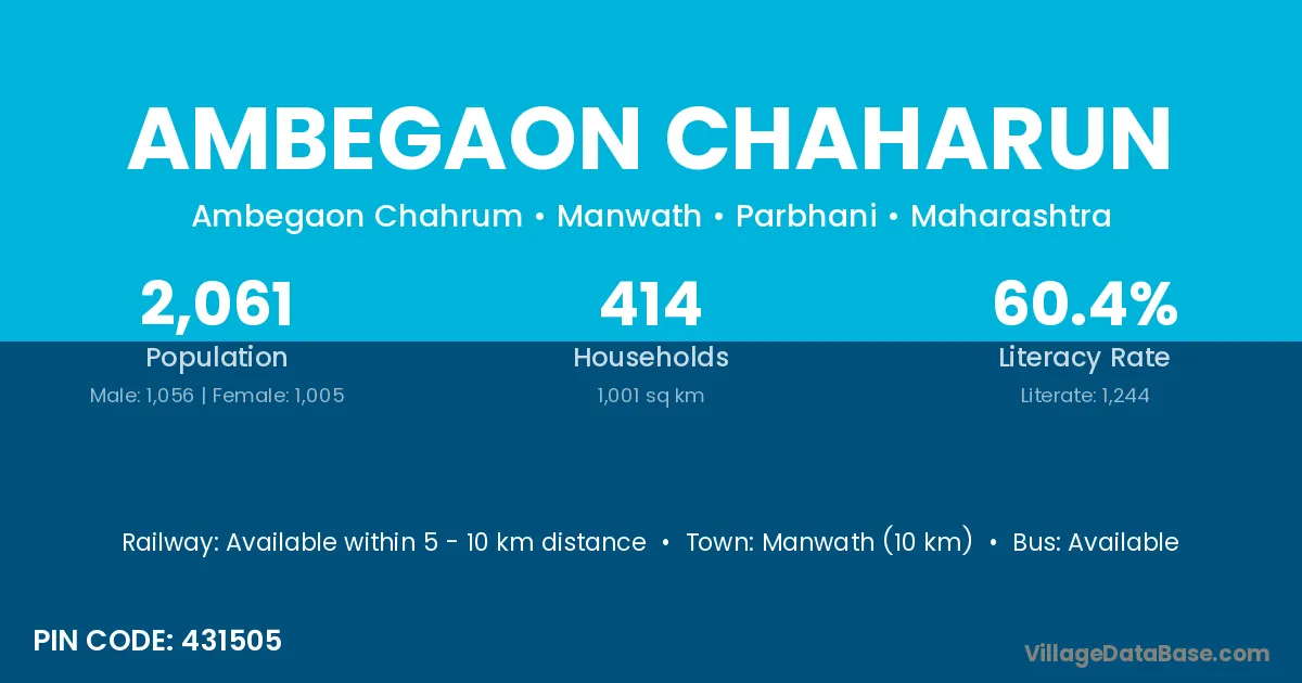 Manwath (10 km) is the nearest town to Ambegaon Chaharun village for major economic activities and is located approximately 10 km away.