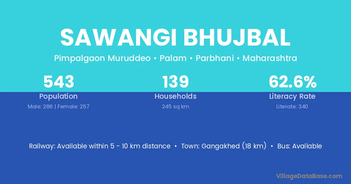 Gangakhed (18 km) is the nearest town to Sawangi Bhujbal village for major economic activities and is located approximately 18 km away.
