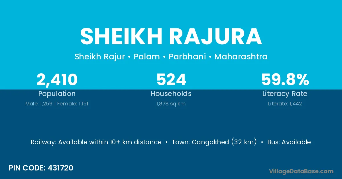 Gangakhed (32 km) is the nearest town to Sheikh Rajura village for major economic activities and is located approximately 32 km away.