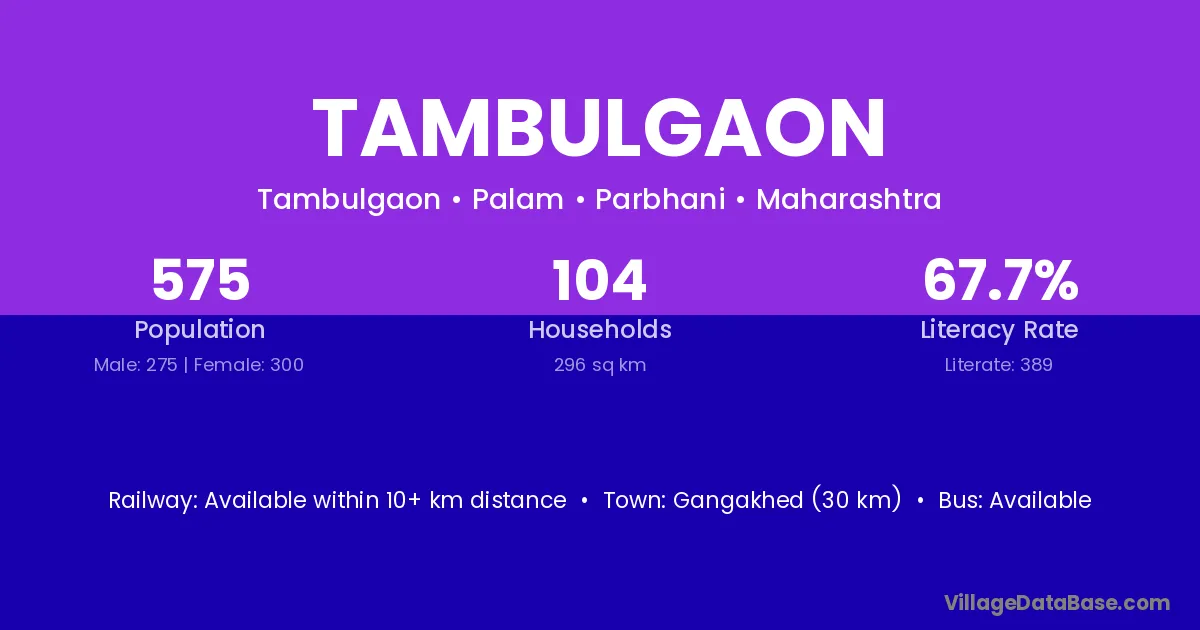 Gangakhed (30 km) is the nearest town to Tambulgaon village for major economic activities and is located approximately 30 km away.