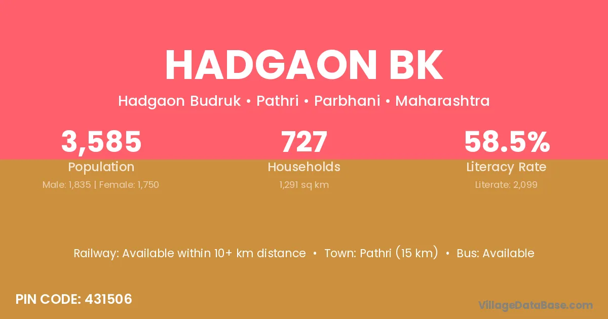 Pathri (15 km) is the nearest town to Hadgaon Bk village for major economic activities and is located approximately 15 km away.