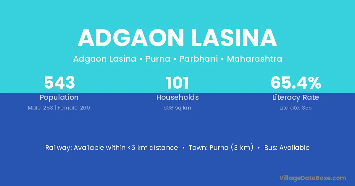 Purna (3 km) is the nearest town to Adgaon Lasina village for major economic activities and is located approximately 3 km away.