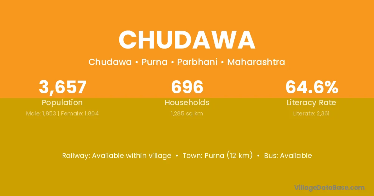Purna (12 km) is the nearest town to Chudawa village for major economic activities and is located approximately 12 km away.