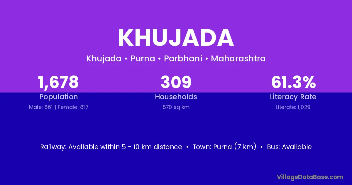 Purna (7 km) is the nearest town to Khujada village for major economic activities and is located approximately 7 km away.