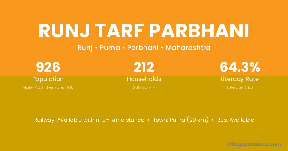 Runj Tarf Parbhani village has a total population of 926 people, of which 466 are males and 460 are females.