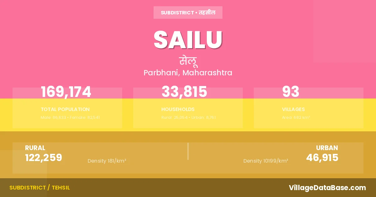 According to the 2011 census The total area of Sailu Tehsil is 682 km², with a population of 169174 people. The population density is 248 inhabitants per square kilometre, and there are approximately 33815 houses in the sub district.