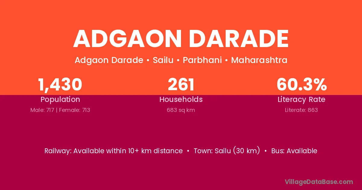 Sailu (30 km) is the nearest town to Adgaon Darade village for major economic activities and is located approximately 30 km away.