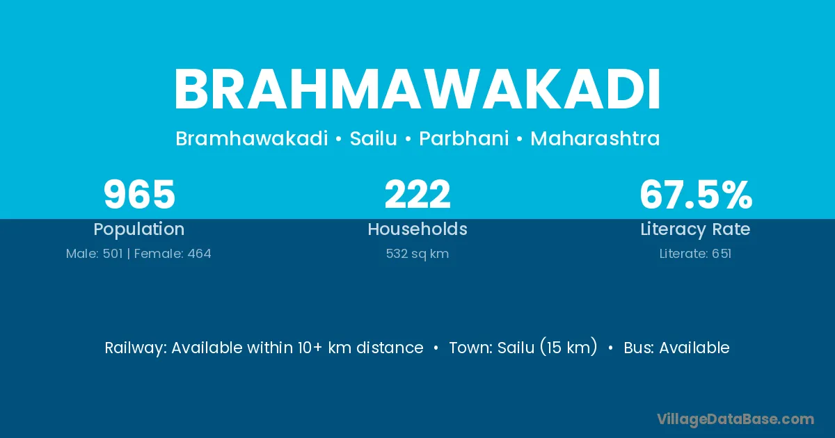 Brahmawakadi village has a total population of 965 people, of which 501 are males and 464 are females.