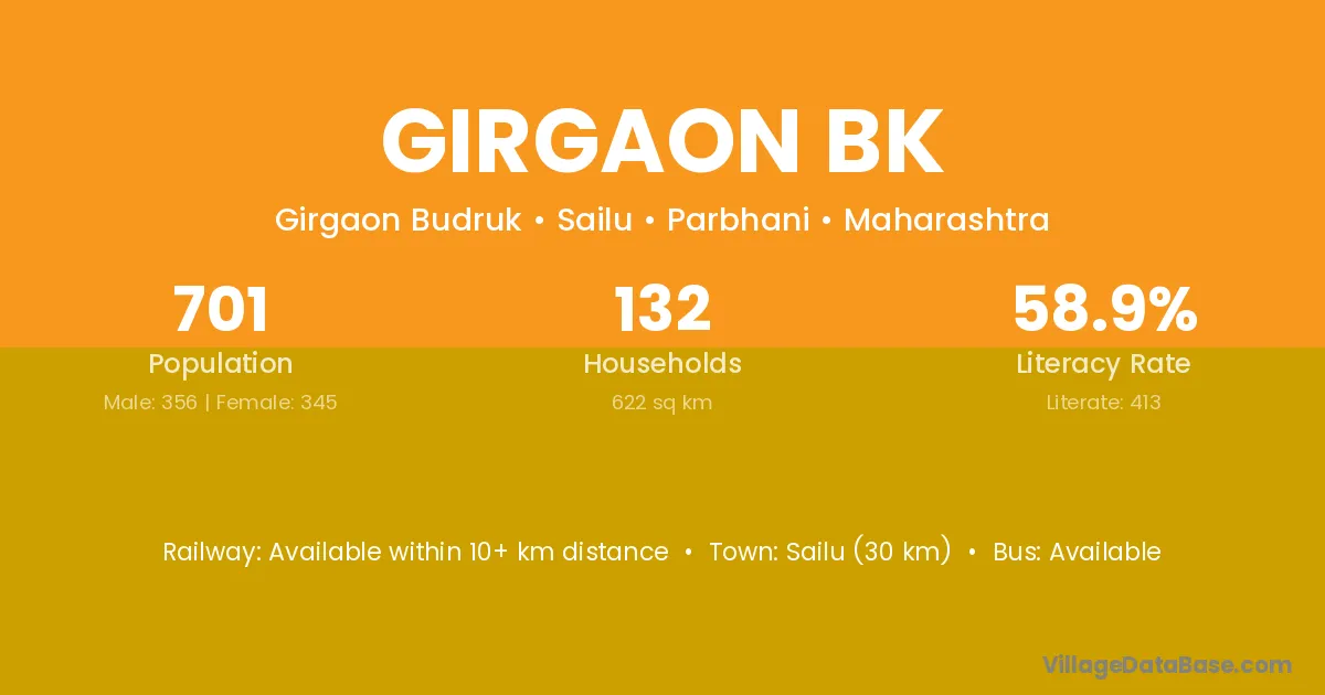 Sailu (30 km) is the nearest town to Girgaon Bk village for major economic activities and is located approximately 30 km away.