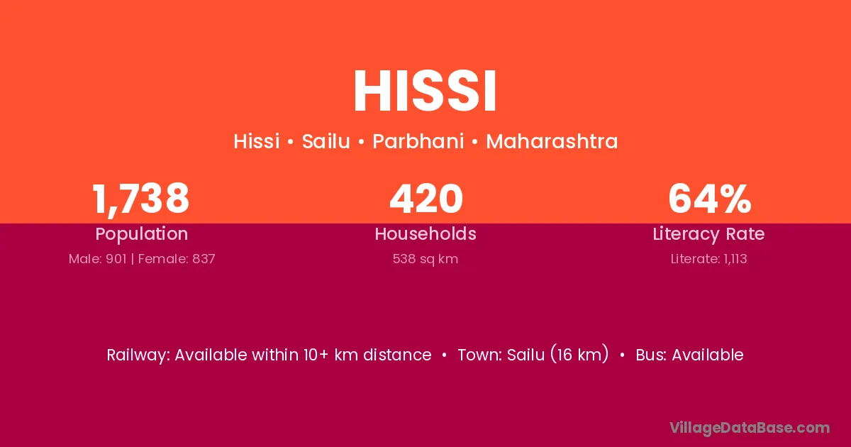 Sailu (16 km) is the nearest town to Hissi village for major economic activities and is located approximately 16 km away.