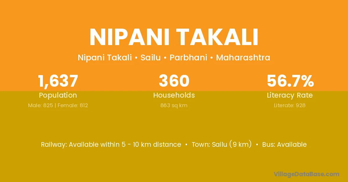 Sailu (9 km) is the nearest town to Nipani Takali village for major economic activities and is located approximately 9 km away.