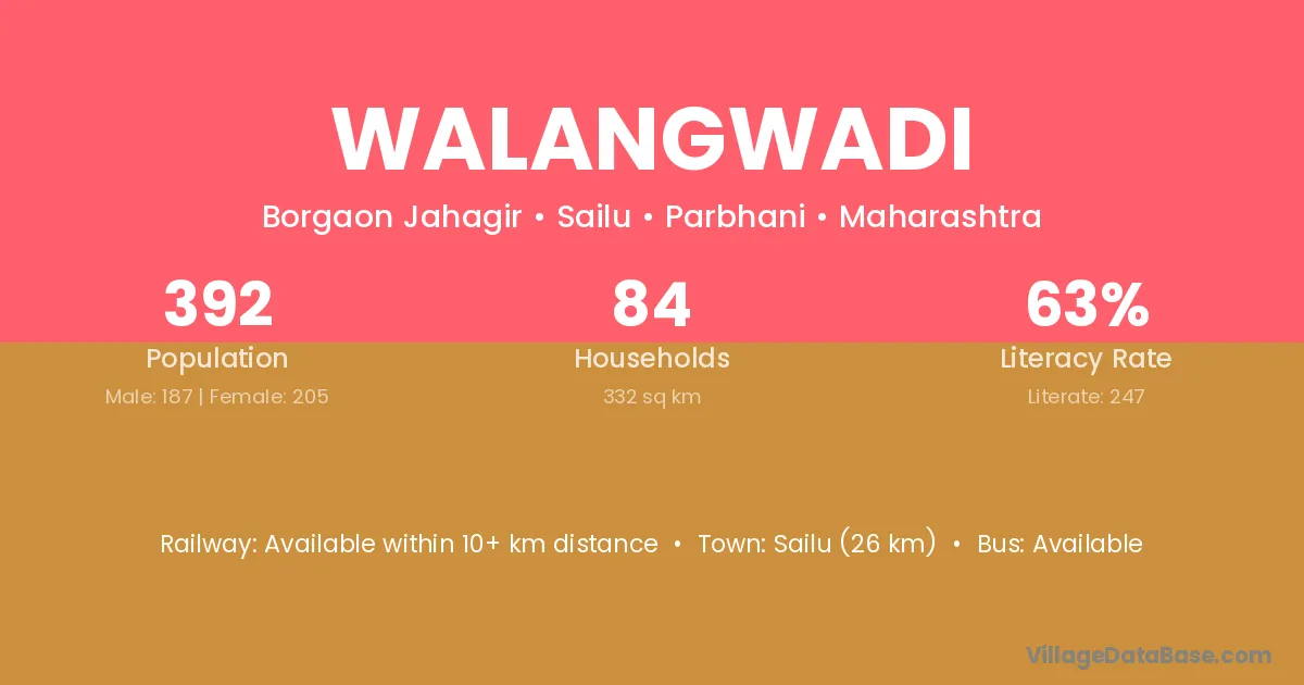 Sailu (26 km) is the nearest town to Walangwadi village for major economic activities and is located approximately 26 km away.