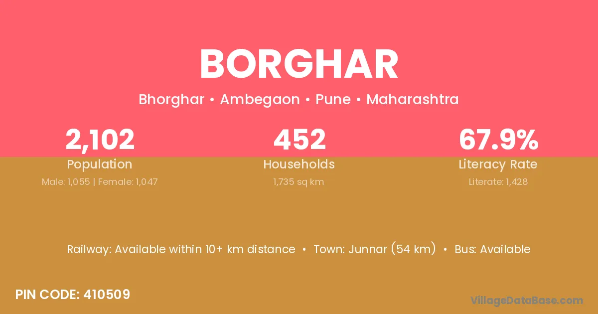 Junnar (54 km) is the nearest town to Borghar village for major economic activities and is located approximately 54 km away.