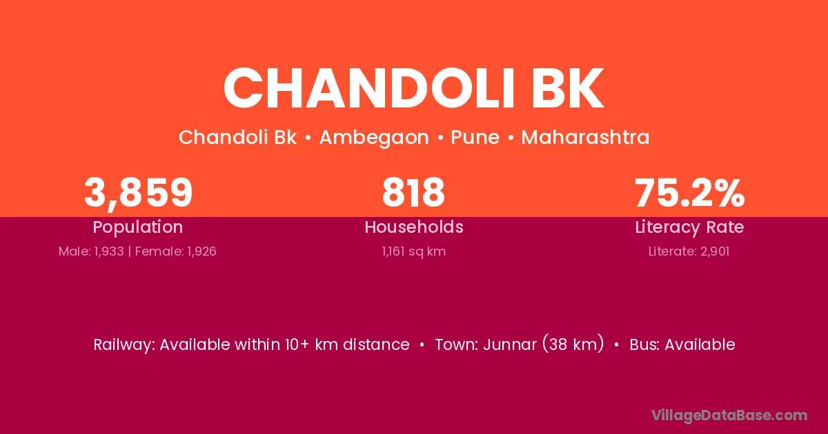 Chandoli Bk village has a total population of 3,859 people, of which 1,933 are males and 1,926 are females.