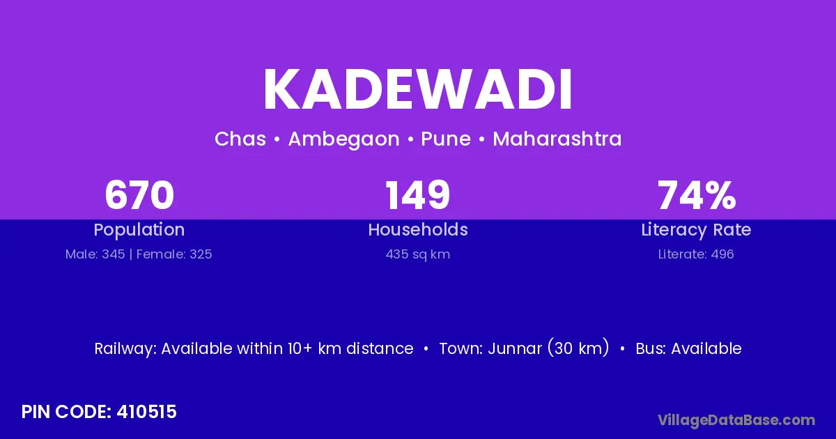 Junnar (30 km) is the nearest town to Kadewadi village for major economic activities and is located approximately 30 km away.