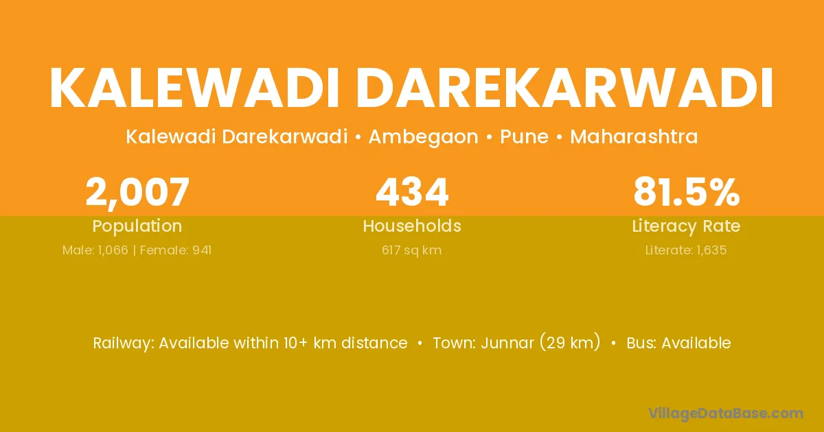 Junnar (29 km) is the nearest town to Kalewadi Darekarwadi village for major economic activities and is located approximately 29 km away.