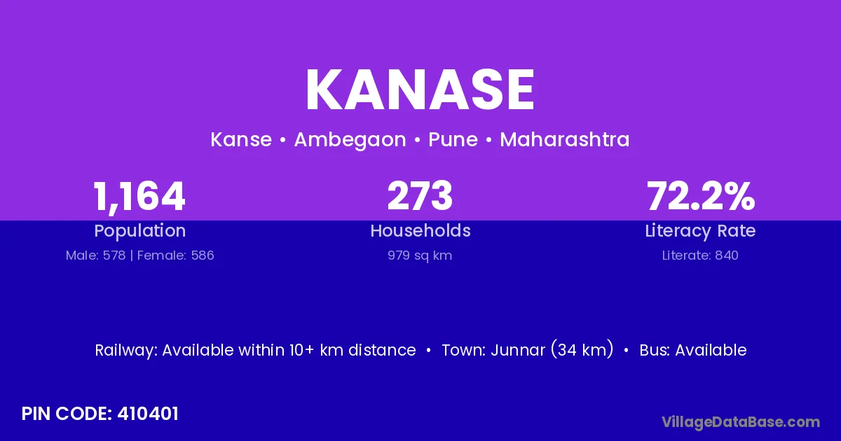 Junnar (34 km) is the nearest town to Kanase village for major economic activities and is located approximately 34 km away.