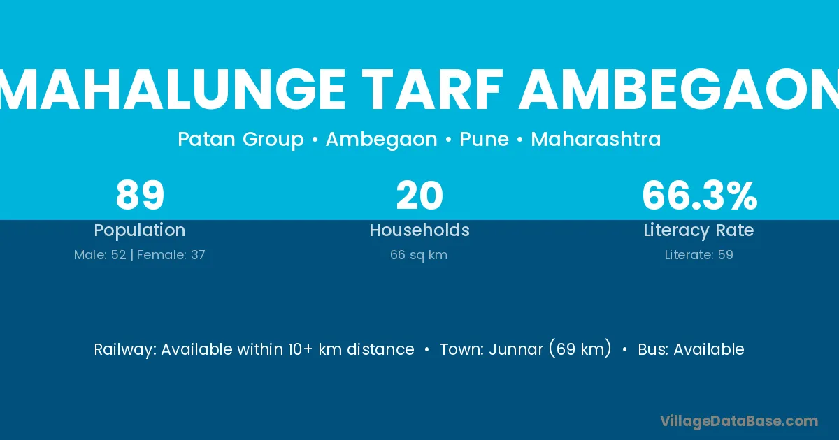 Mahalunge Tarf Ambegaon village has a total population of 89 people, of which 52 are males and 37 are females.