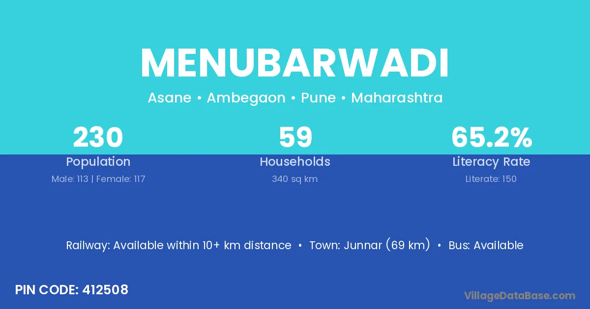 Junnar (69 km) is the nearest town to Menubarwadi village for major economic activities and is located approximately 69 km away.