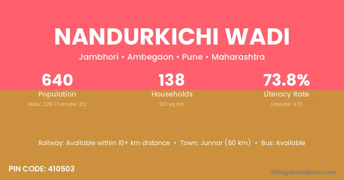 Junnar (60 km) is the nearest town to Nandurkichi Wadi village for major economic activities and is located approximately 60 km away.