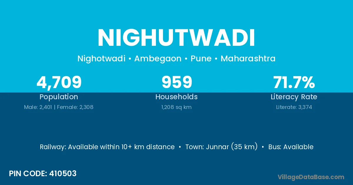 Junnar (35 km) is the nearest town to Nighutwadi village for major economic activities and is located approximately 35 km away.