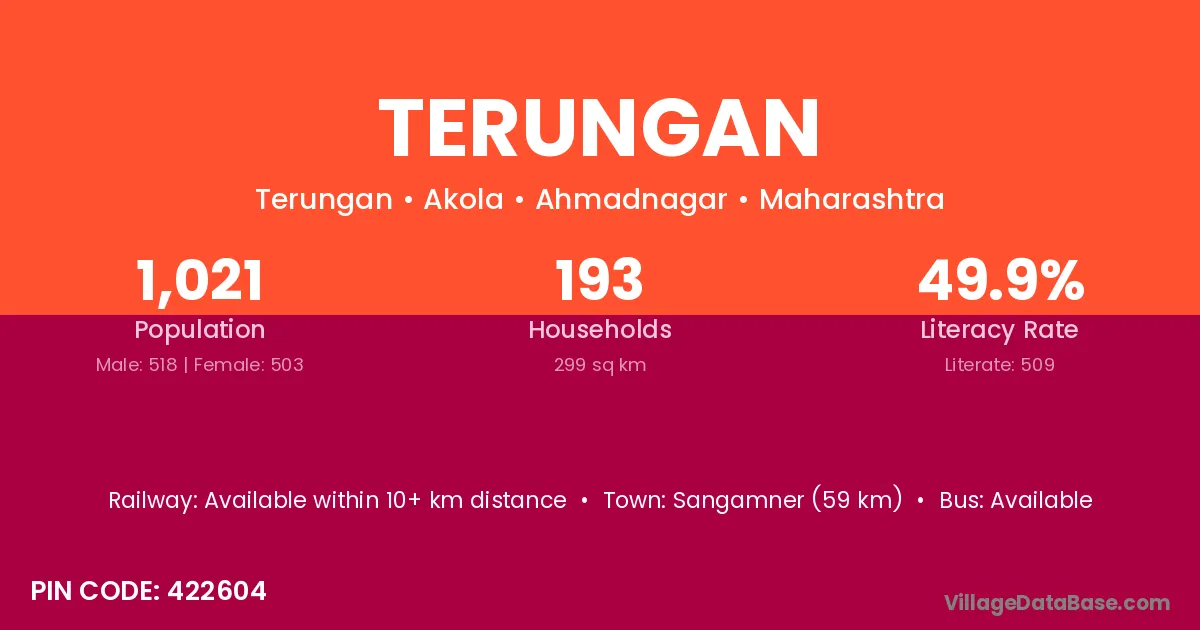 Junnar (8 km) is the nearest town to Terungan village for major economic activities and is located approximately 8 km away.