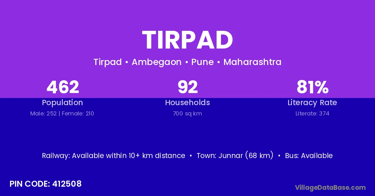 Junnar (68 km) is the nearest town to Tirpad village for major economic activities and is located approximately 68 km away.