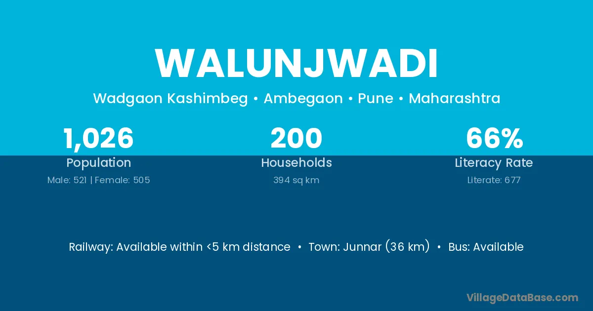 Junnar (36 km) is the nearest town to Walunjwadi village for major economic activities and is located approximately 36 km away.