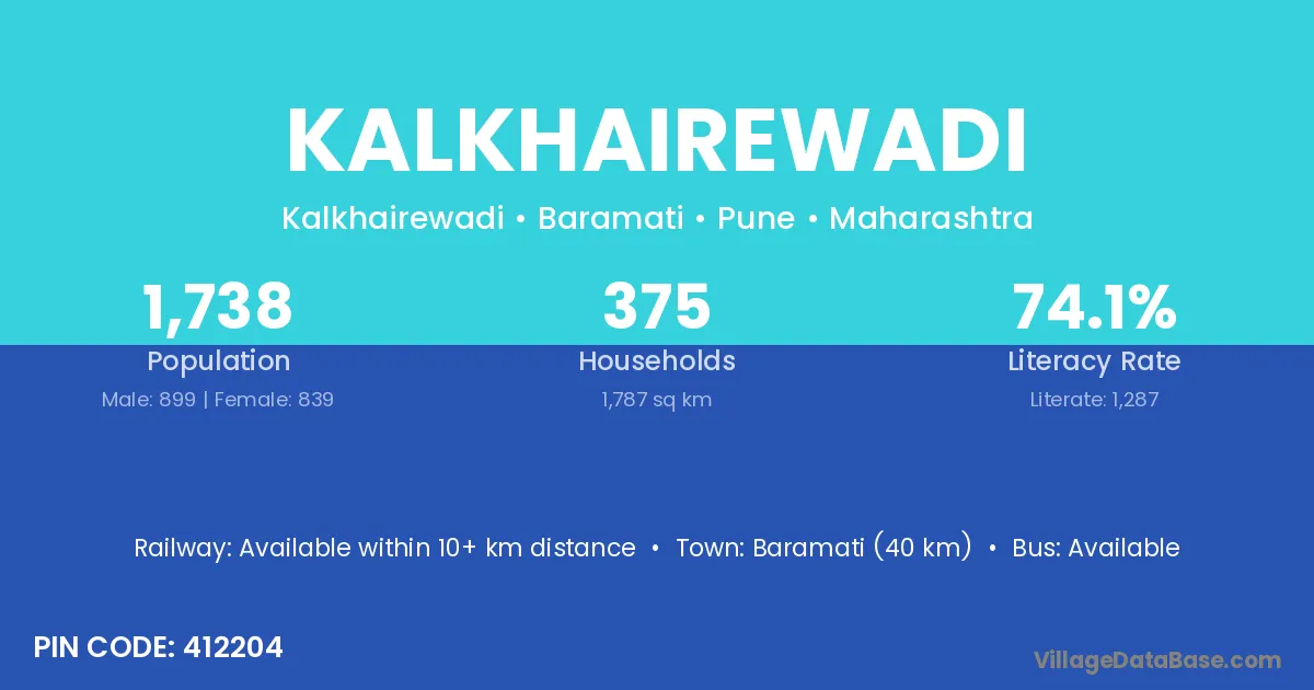 Baramati (40 km) is the nearest town to Kalkhairewadi village for major economic activities and is located approximately 40 km away.
