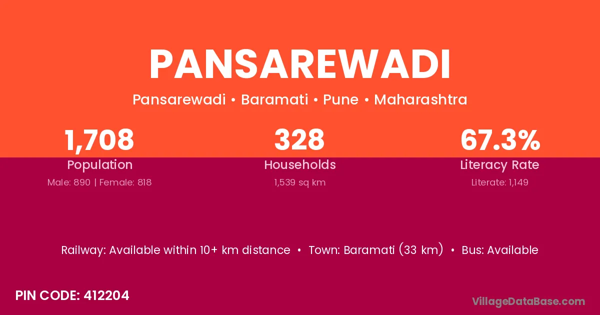 Baramati (33 km) is the nearest town to Pansarewadi village for major economic activities and is located approximately 33 km away.